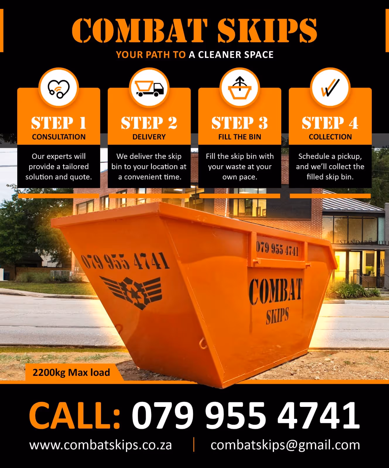 This project created a series of social media ads for Combat Skips, highlighting their four-step waste removal process with bold visuals featuring their signature orange skip bins and winged recycling logo.